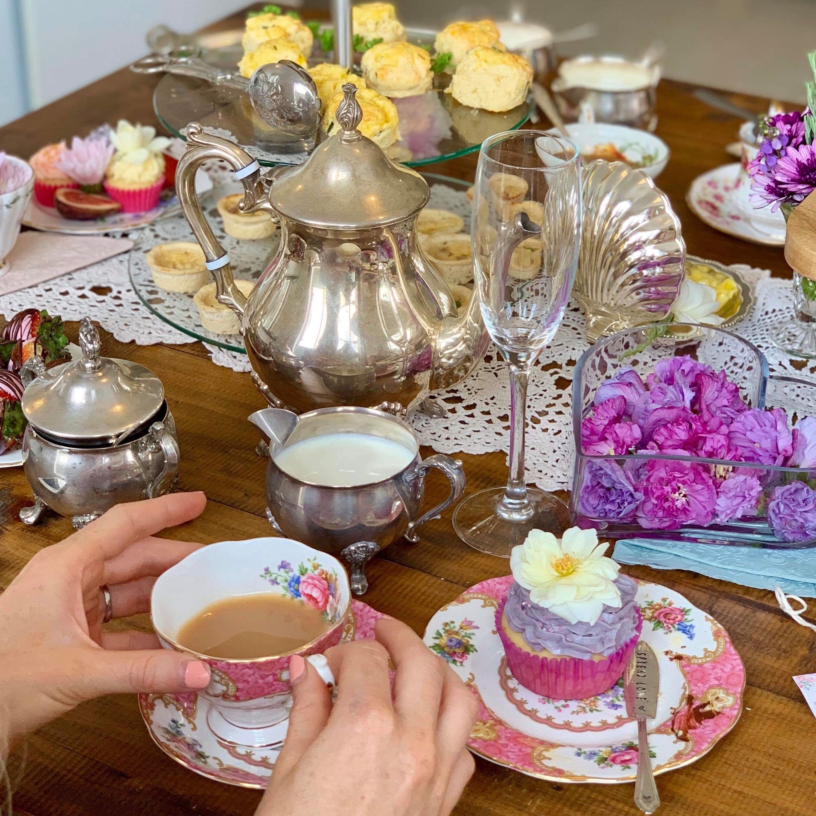 As a sentimental person with an appreciation for the finer things of yesteryear, I love a good high tea table filled with ornate silverware, fresh cut flowers, vintage hand crocheted doilies, and delicious sweets. To complete the picture, get the hot tea flowing into pretty fine china teacups, and surround the table with good friends, nostalgia and laughter. Perfection.